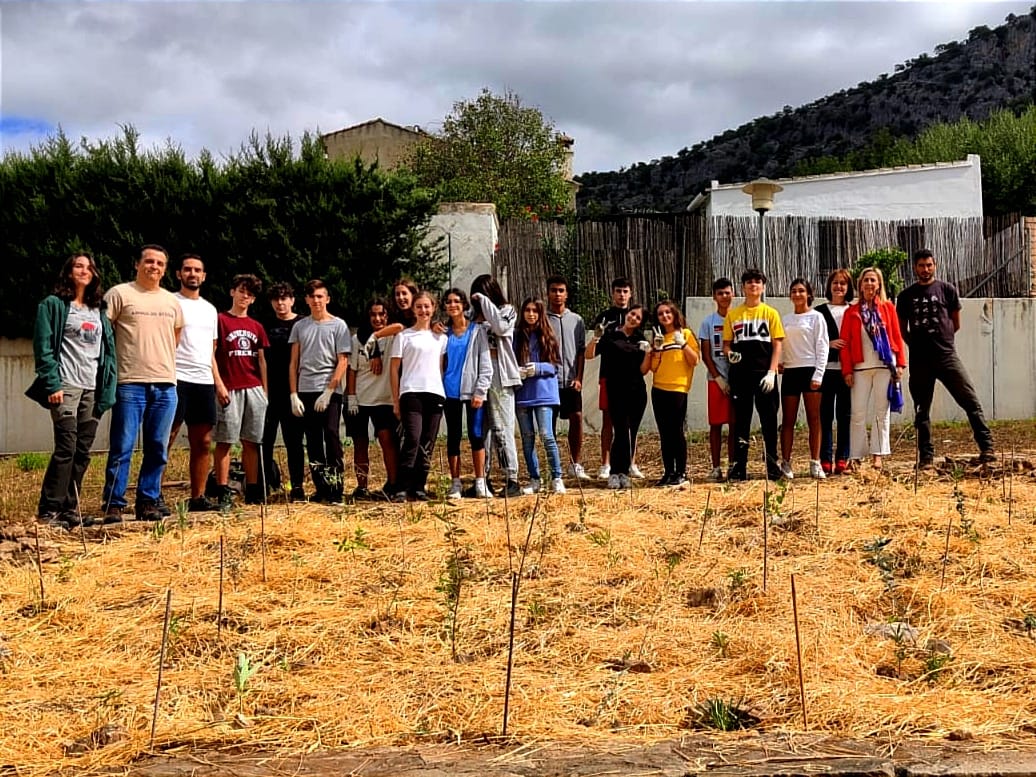 El alumnado de 4° de E.S.O. que el año pasado participó en la jornada de sensibilización y formación enmarcada en el proyecto, de las asociaciones Grazalema 2030 y O-live Medioambiente, Bosques 2030 sobre el cambio climático y la importancia de los bosques realizó este jueves, 29 de septiembre, la plantación de un bosque isla.
